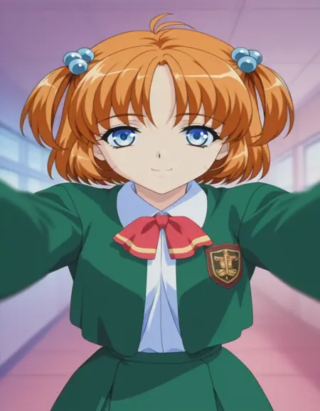 Suzune Takasu: suzune, light blue eyes, dark orange hair, short hair, hair bobbles, two side up, school uniform, red bow, ribbon, green jacket, white blouse, green skirt