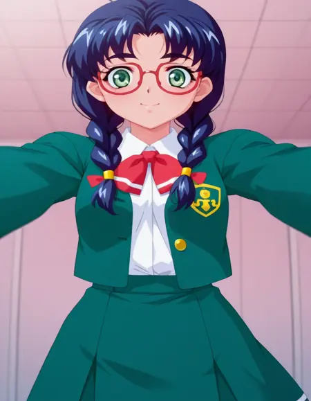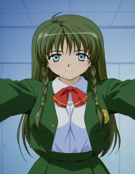 Reiko Koga: reiko, light blue eyes, green hair, twin braids, long hair, school uniform, red bow, ribbon, green jacket, white blouse, green skirt