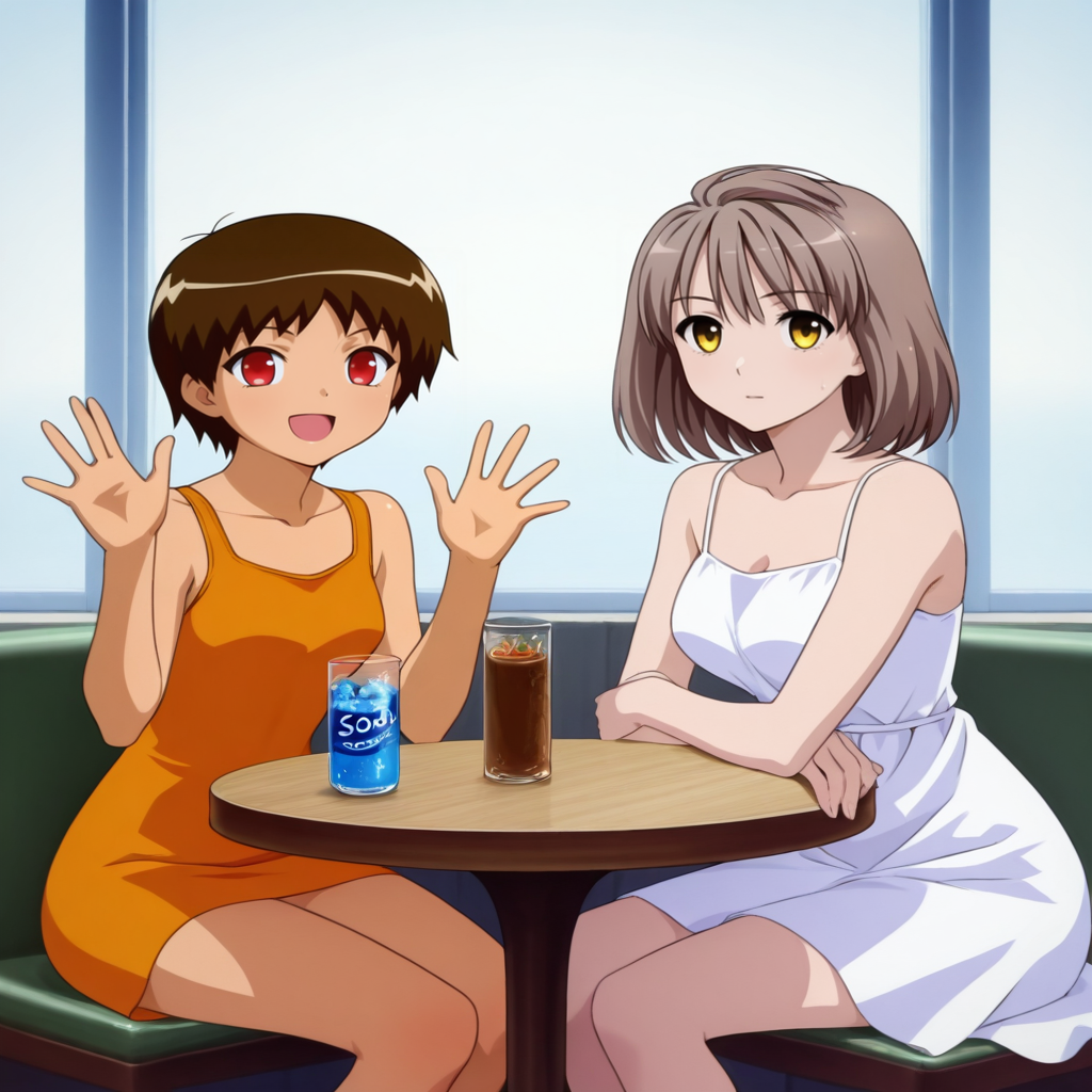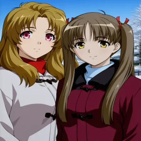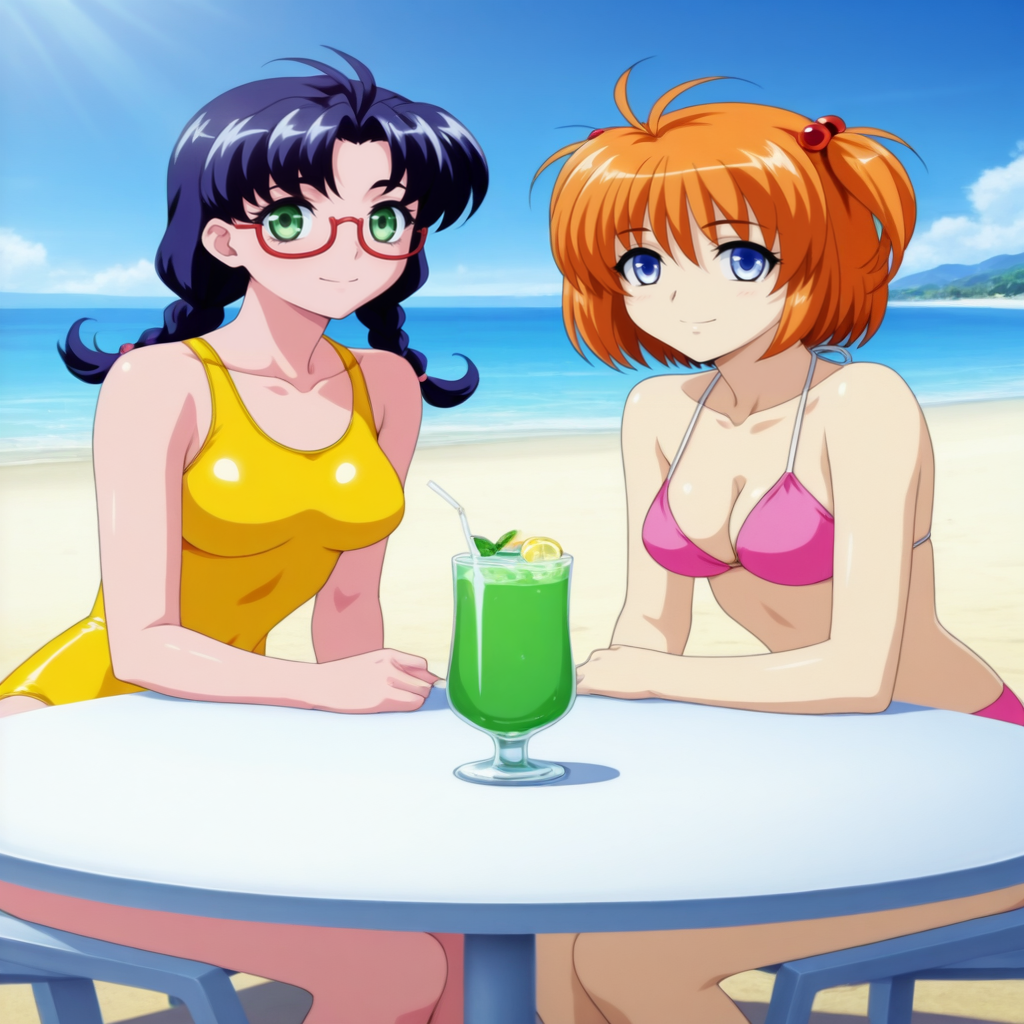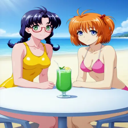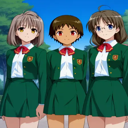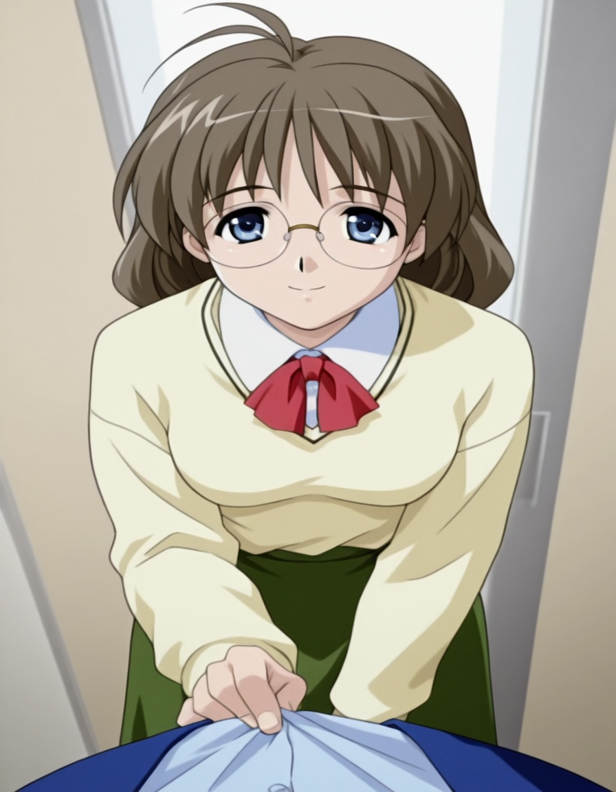 Otori Kaori: Kaori, blue eyes, brown hair, glasses, rimless eyewear, light yellow sweater, long sleeves, red bow, green skirt