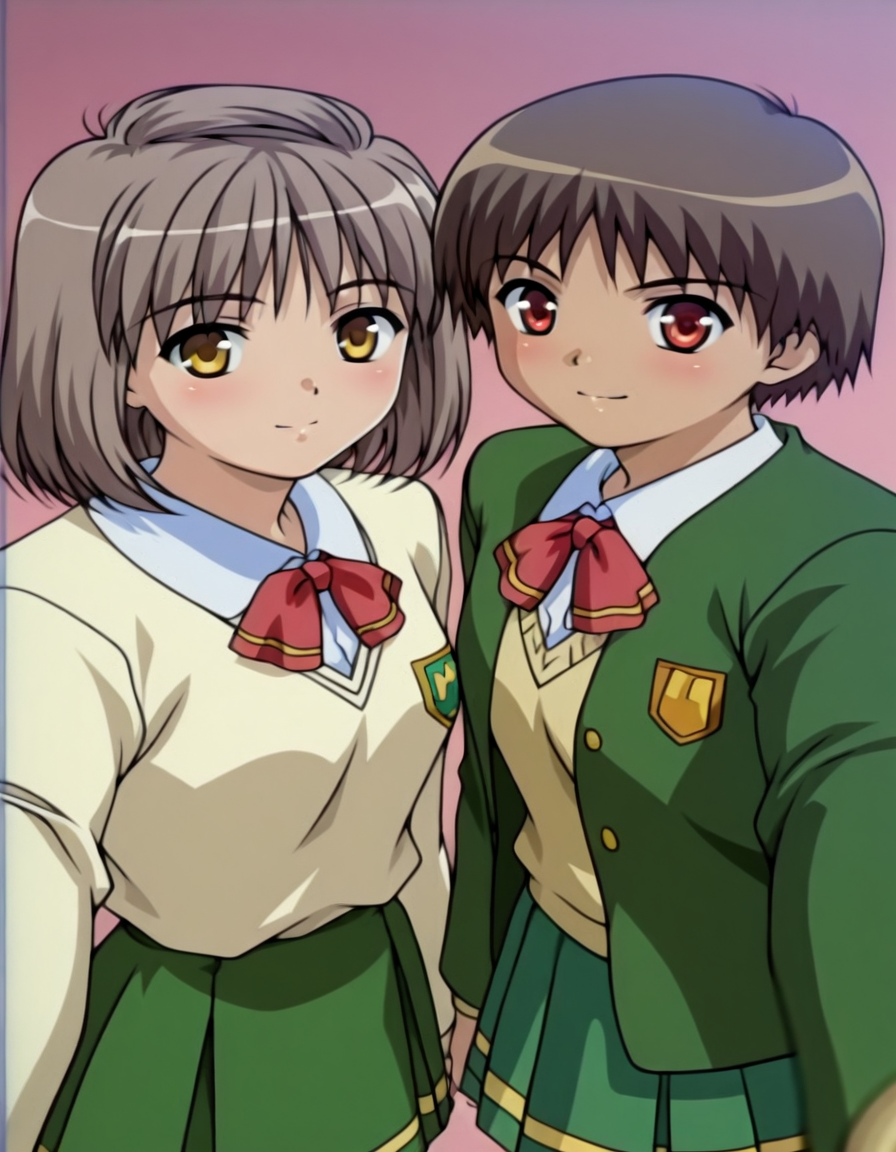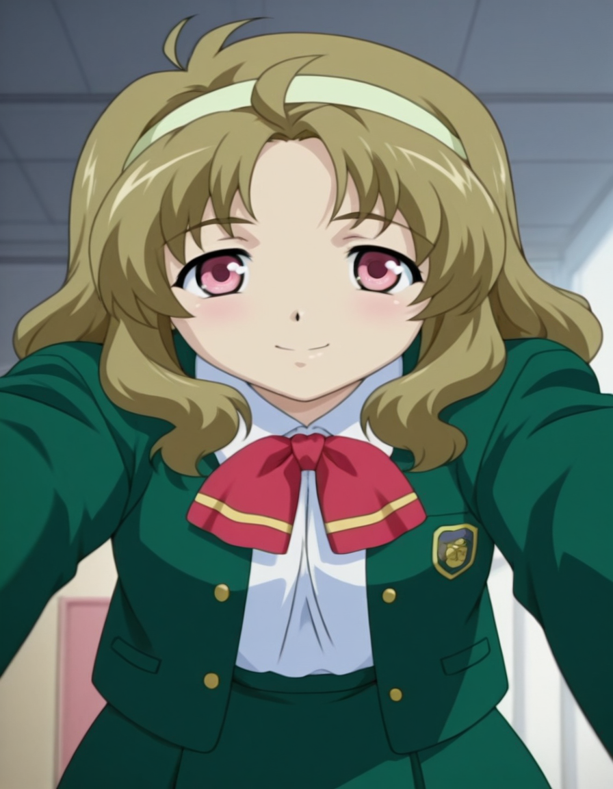 Ayano Ozawa; ayano, pink eyes, brown hair, light green hairband, school uniform, red bow, green jacket, white blouse, green skirt