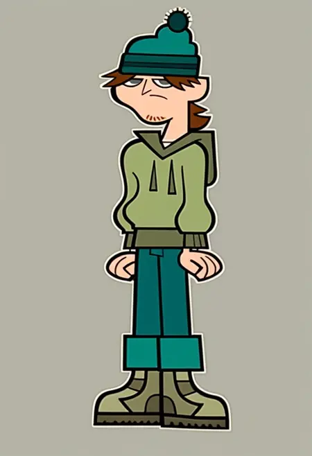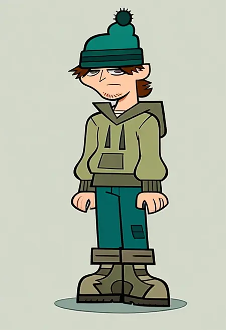 EzekielTDI, 1boy, brown hair, gray eyes, green hoodie, white undershirt, bluish-green jeans, bluish-green hat, green hiking boots, chubby, facial hair,