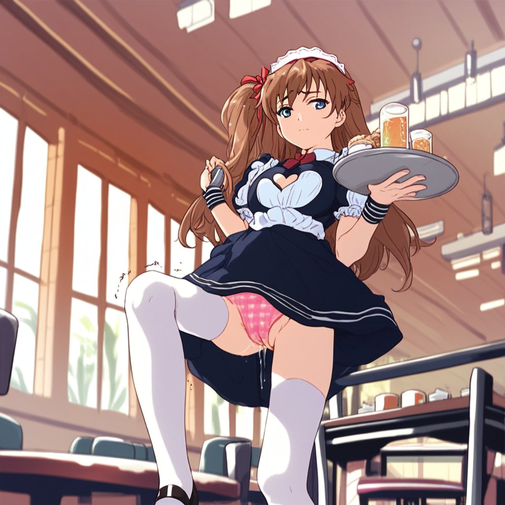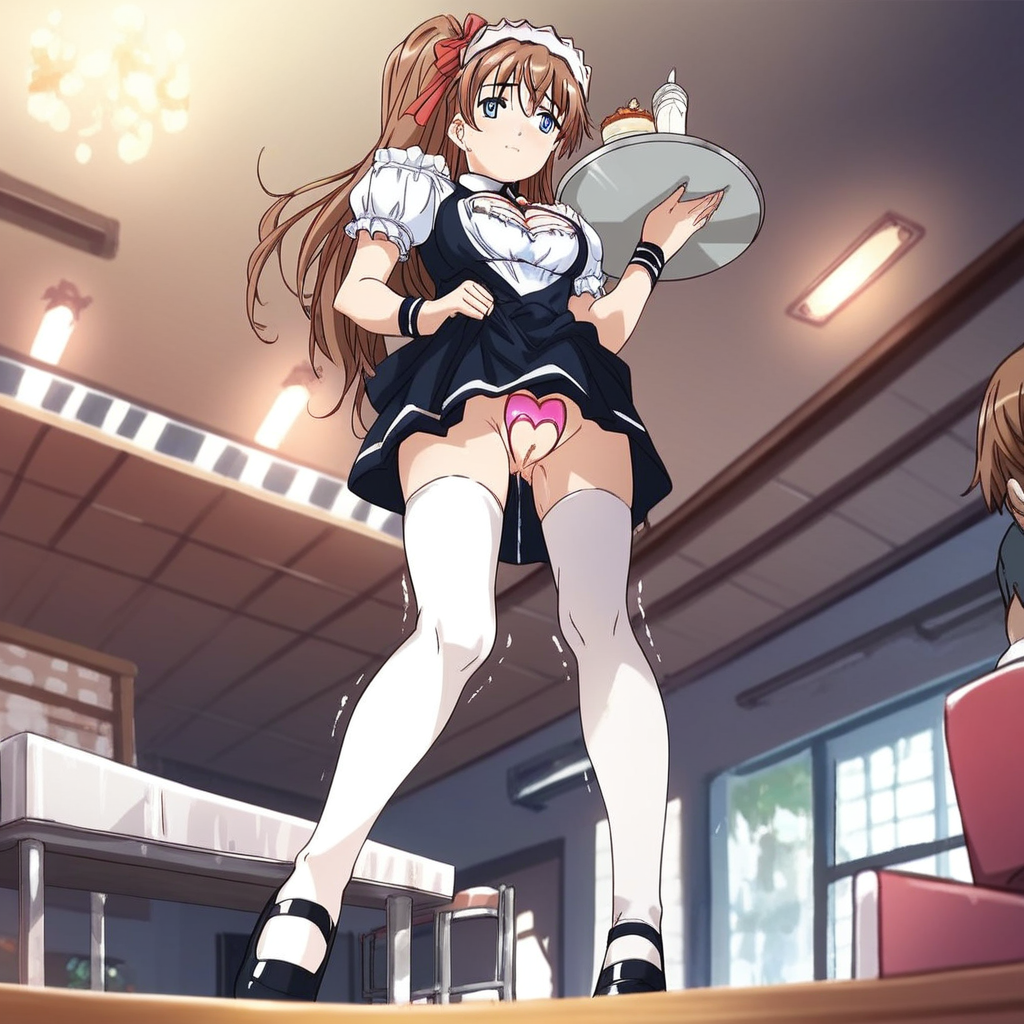 maid headdress, maid outfit, heart cutout cleavage, maid skirt, white thighhighs, maid shoes