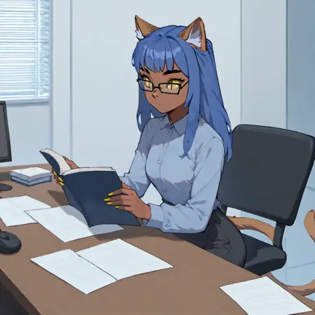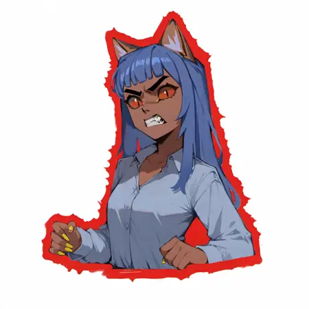 描述性辅助词:黄色眼睛、深色皮肤、深蓝色头发、长发、浅蓝色衬衫、有领衬衫、猫耳、小乳房、黑色眉毛、猫尾、黄色指甲