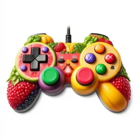 프롬프트: 이것은 (주제) 모양으로 디자인된 색색의 맞춤형 비디오 게임 컨트롤러를 촬영한 고해상도 사진입니다.