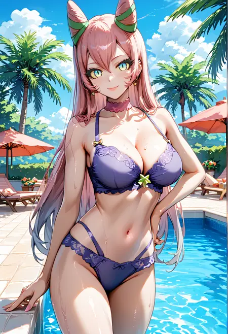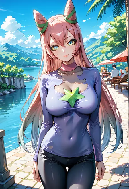 트리거 포함: nyandestar \(yu-gi-oh!\), 노란 공막, 파란 동공, 더블 헤어 둥글게, 분홍 머리, 그라디언트 머리, 보라색 셔츠, 바디스톡킹, 옷 자르기, 녹색 별,