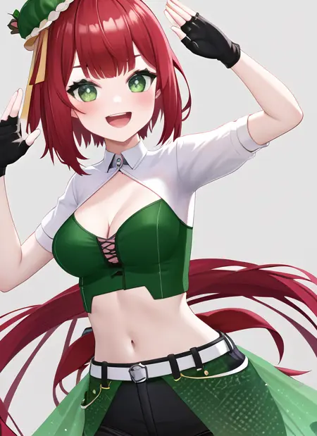 solo, 1girl, hiseki erio, Erio_show, green_eyes, red_hair, collarbone, breasts, cleavage, gloves, black gloves, fingerless gloves, green_skirt, shorts, navel, thighhighs, high_ponytails, ponytail, hair ornament, gold_striped thighhighs, lace-trimmed legwear, white belt, belt