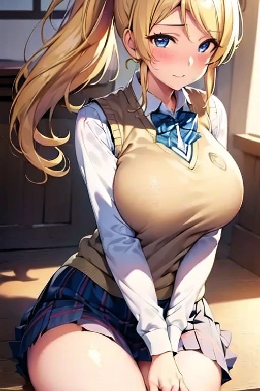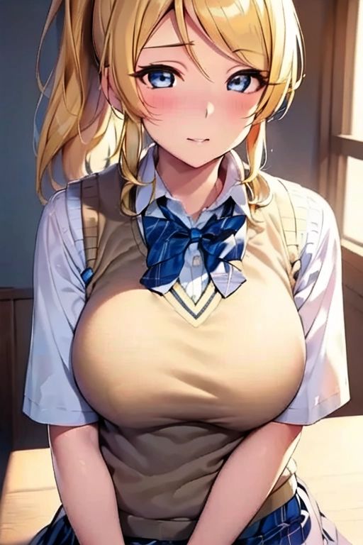 Trigger words: ayase_a, blonde hair, ponytail, blue eyes, big breasts, otonokizaka school uniform, summer uniform, sweater vest, school uniform, skirt, pleated skirt, plaid blue skirt,