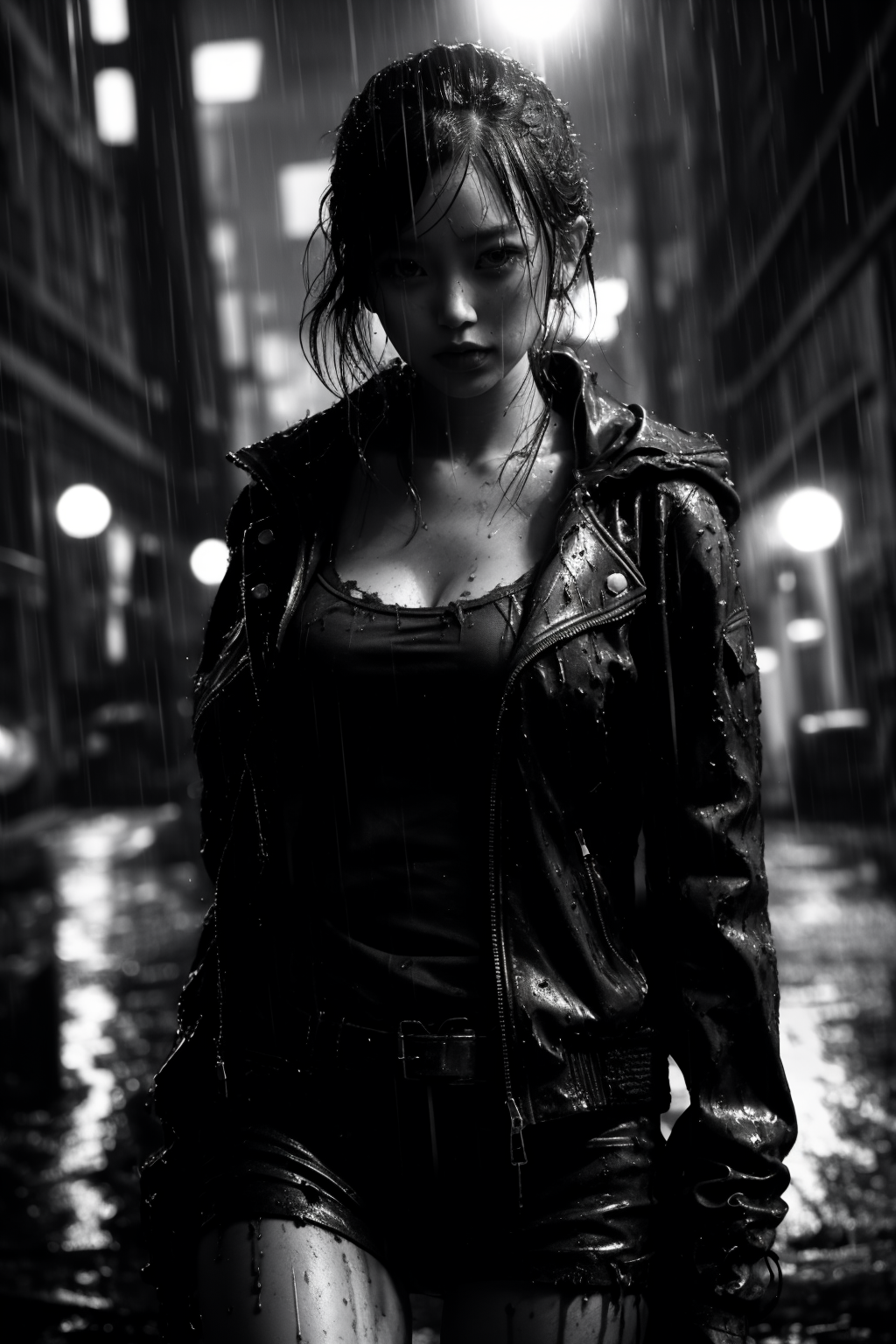 私のモデルは主に2つのコンテンツのセグメントでトレーニングされています。最初のセグメントは、モノクロスタイルでの光と影に焦点を当てています。2番目のセグメントは、モノクロの光と影を以下の要素と統合しています:雨、水、廃墟となった都市、森、ジャケットを着た少女