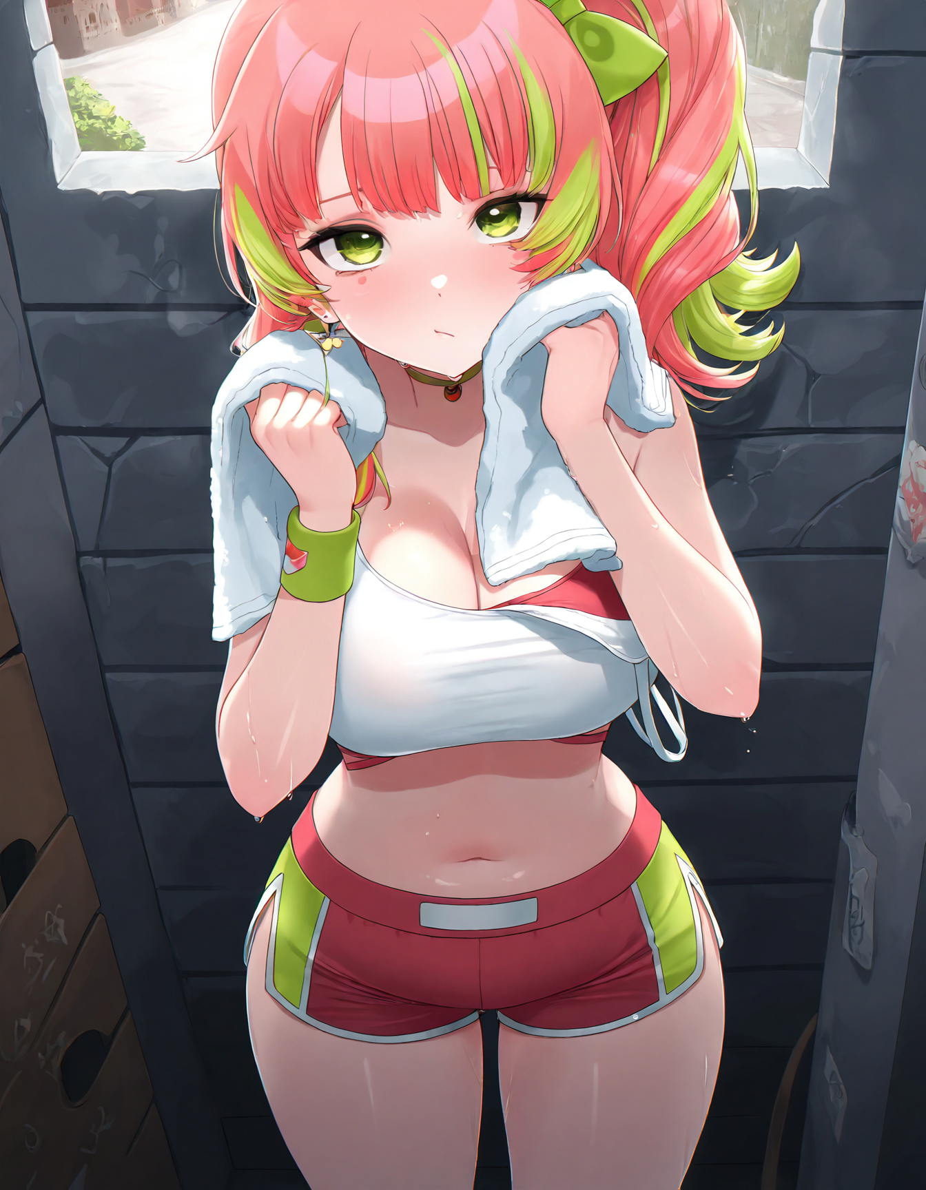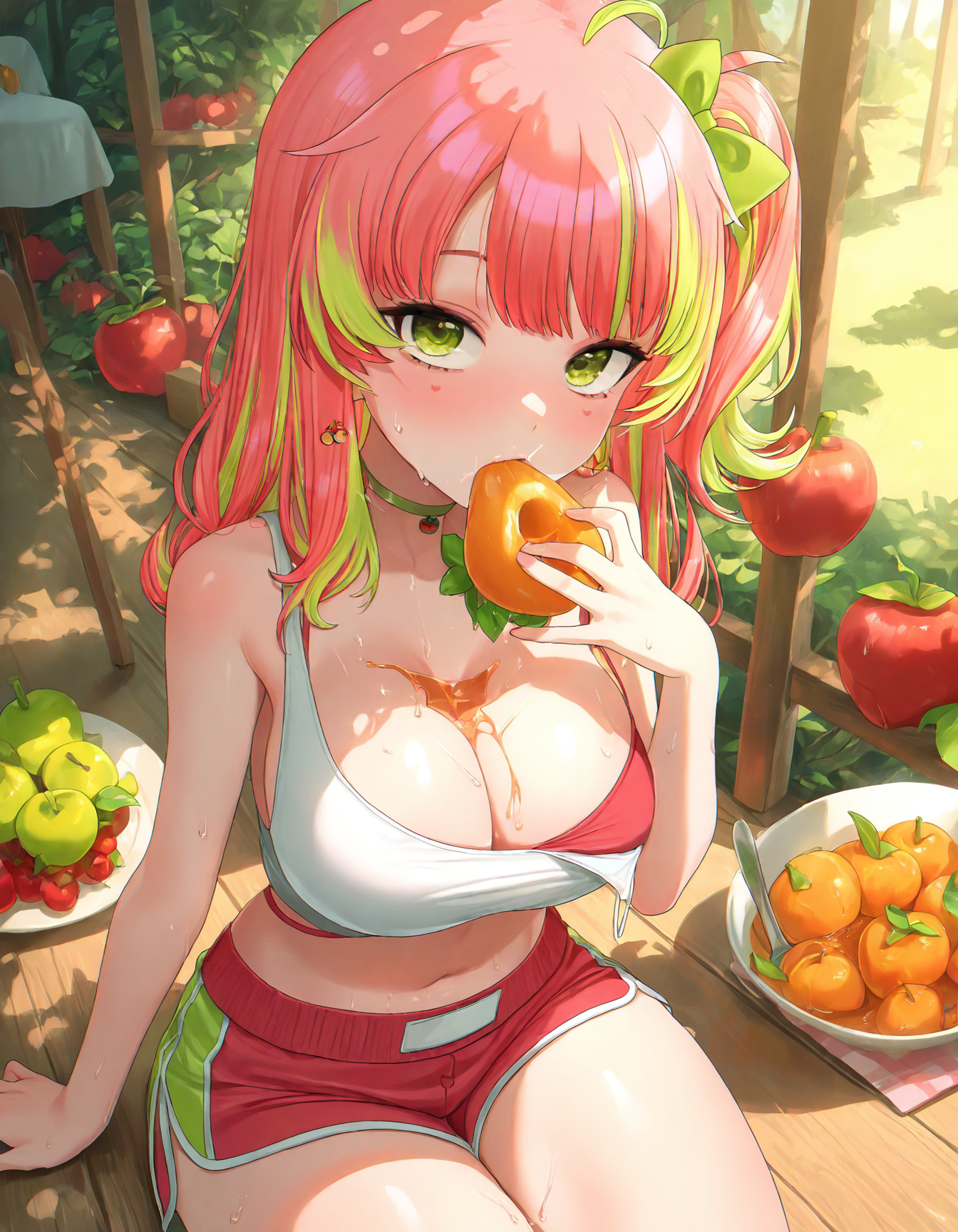 Toma, 红发, 绿发, 大胸, 虚拟主播, 绿眼, 宽臀, 红色露脐装, 白色露脐装, 红色短裤,