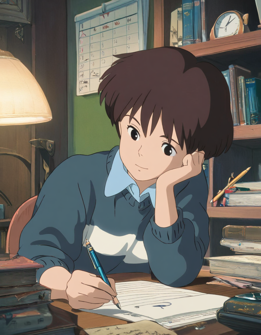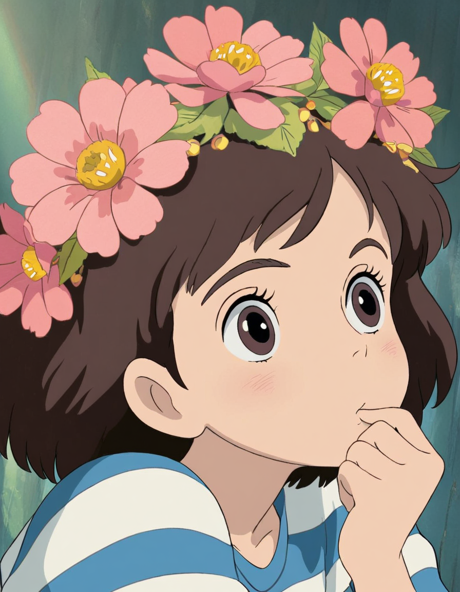 Studio Ghibli, 손으로 그린 애니메이션 스타일, 걸작, 높은 점수, 귀여운 소녀, 초상화, 갈색 머리, 꽃왕관, 줄무늬 셔츠, 손으로 입을 가리고, 큰 눈, 귀여움, lora:Ghibli_xl_v2:1