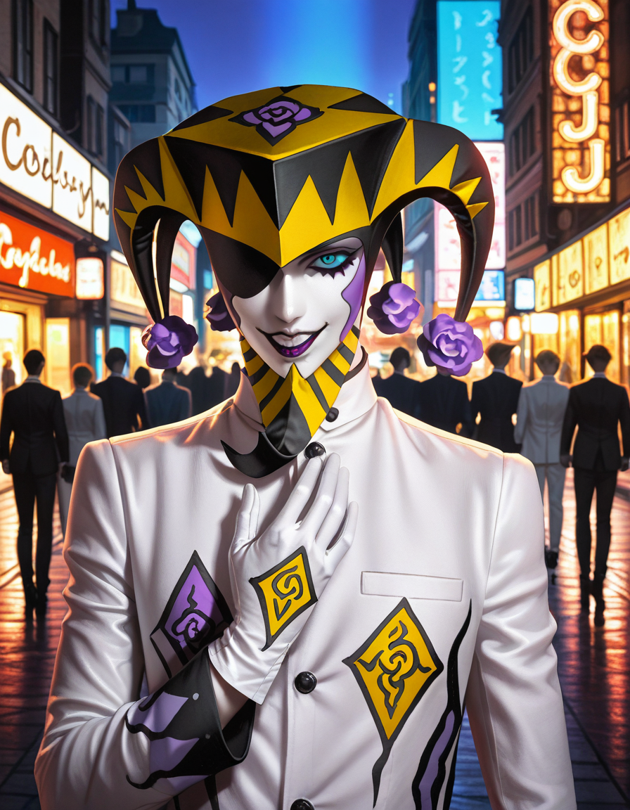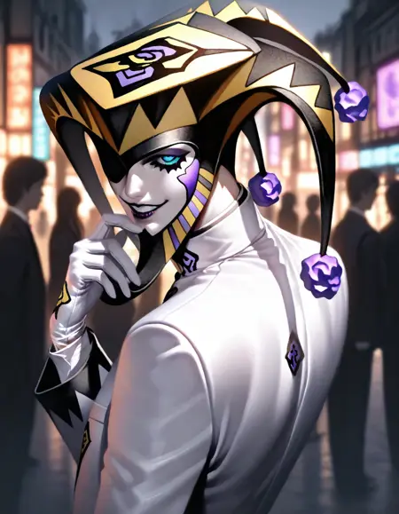 プロンプトの例: 1boy, p2joker, one eye covered, jester cap, white gloves, formal, evil,half body, dynamic pose, city, night, darkness,