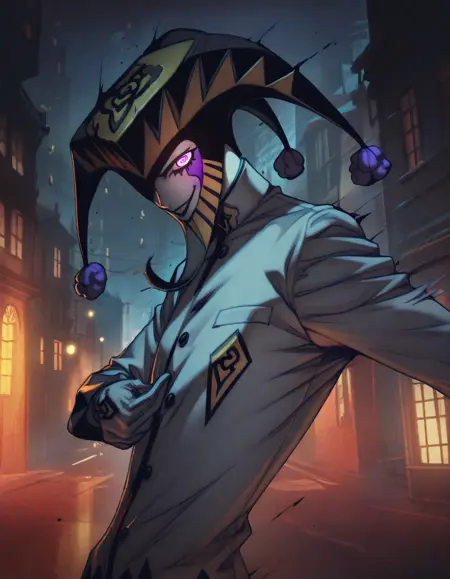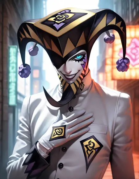 프롬프트 예시: 1boy, p2joker, one eye covered, jester cap, white gloves, formal, evil,half body, dynamic pose, city, night, darkness,