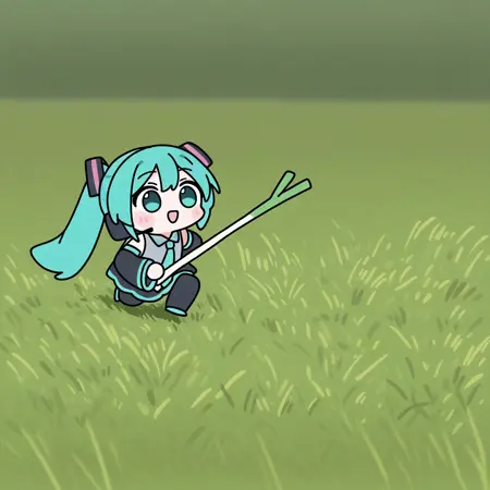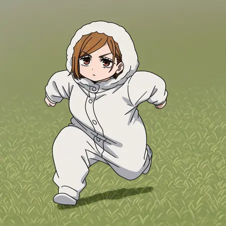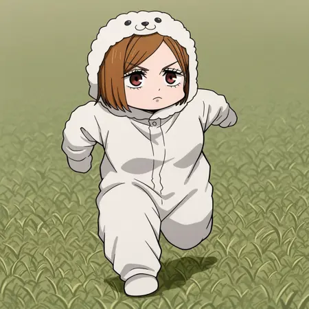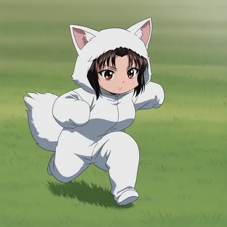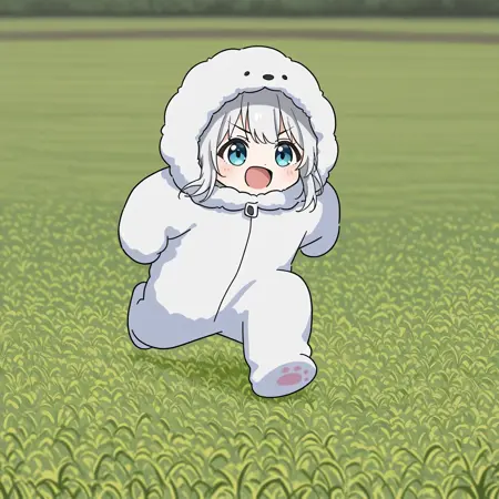 effort effort, meme, parody, chibi, kigurumi, white costume, running, meadow, field