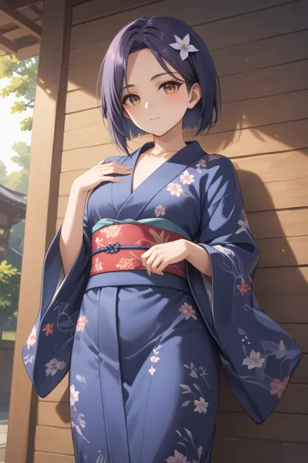 - rinwell, 1girl, 和服, 日式服装, 单人, 腰带, 脸红, 头饰, 紫色头发, 蓝色和服, 带子, 直视观众, 短发, 嘴唇闭合, 棕色眼睛, 宽袖, 头发花朵, 刘海, 花卉图案, 手放胸口, 花朵, 站立, 长袖, 泳衣, 中景镜头, 锁骨, 木墙, 户外, 印花和服