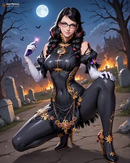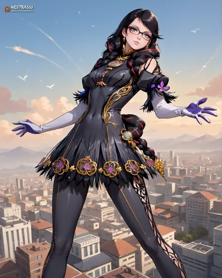 | 训练词汇 | (bayonetta3_nostra, slender yet curvy figure, mid-length 70s style haircut with a bang sweeping to the right, long braided pigtails, red streaked hair, long locks, gray eyes, blue eyes, mole, braid, twin braids, long hair, mole under mouth, black hair, medium breasts:1.2),已复制! (red ribbon in hair, glasses, earrings, jewelry, puffy short sleeves, (black bodysuit, white elbow gloves, black bodysuit made of hair, skinsuit, (huge black ribbon made of hair on the back with very long twin braids, black leather bodysuit with gold accents):1.2), pink makeup, pink eyeshadow, pink lipstick, jewelry, amulet, feathered sleeves, high heels, (skirt made of long black feathers:1.25), gold accents),已复制! (weapon, gun, holding gun, purple pistols, four pistols, 4 pistols, pistols as heels:1.1),已复制! |