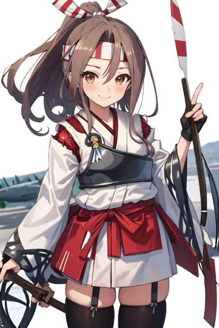 触发词为 zuihou_kantaicollection,推荐标签为:best quality, masterpiece, highres, solo, {zuihou_kantaicollection:1.15}, long_hair, brown_eyes, ponytail, brown_hair, headband, hachimaki, high_ponytail, smile, blush。
