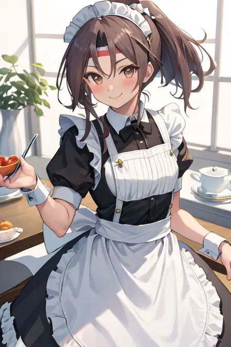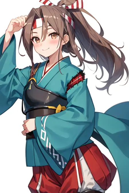 トリガー語はzuihou_kantaicollection、推奨タグはbest quality, masterpiece, highres, solo, {zuihou_kantaicollection:1.15}, long_hair, brown_eyes, ponytail, brown_hair, headband, hachimaki, high_ponytail, smile, blushです。