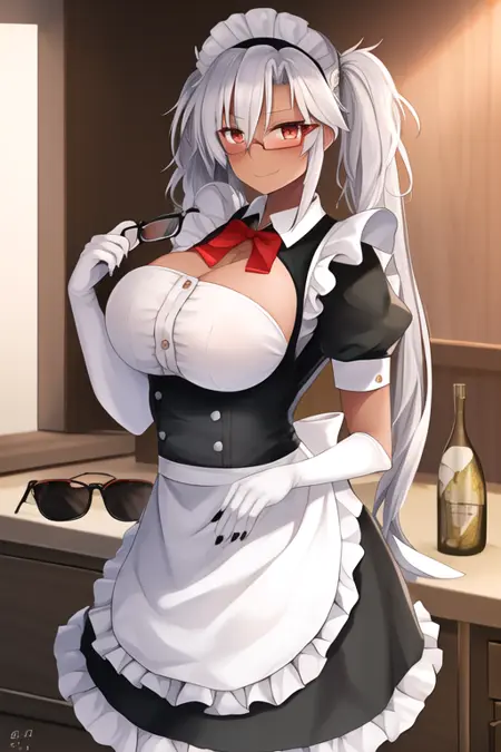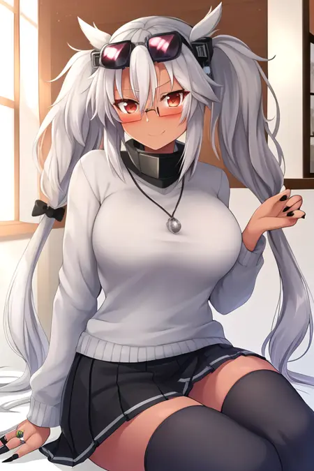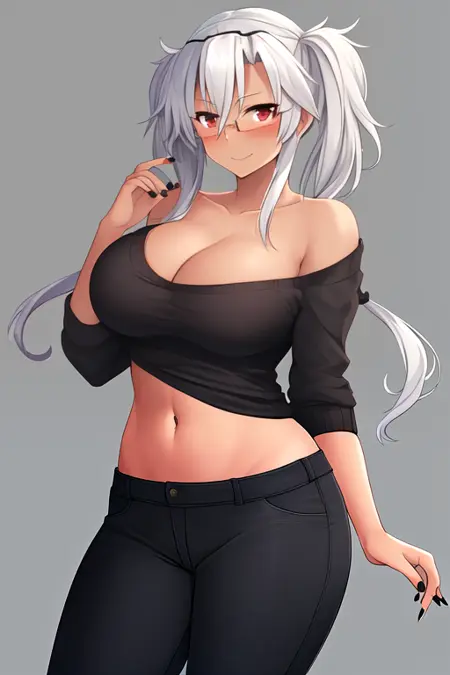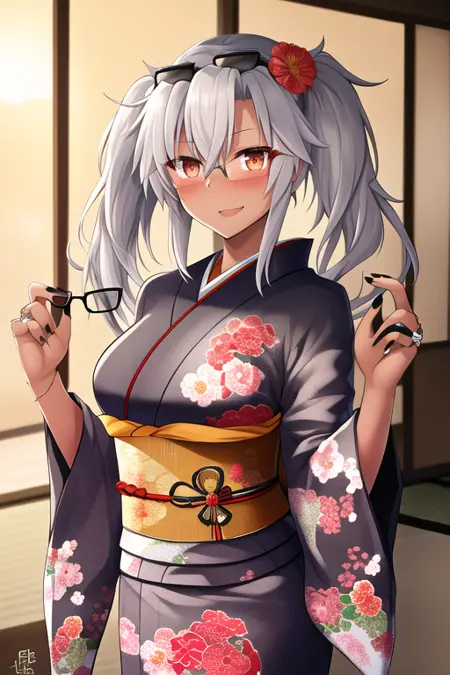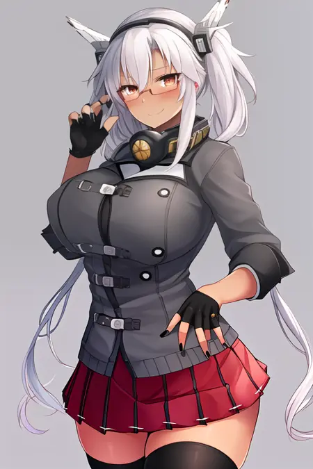 The trigger word is musashi_kantaicollection, and the recommended tags are best quality, masterpiece, highres, solo, {musashi_kantaicollection:1.15}, dark-skinned_female, dark_skin, glasses, long_hair, hair_between_eyes, breasts, large_breasts, white_hair, twintails, brown_eyes, smile, red_eyes, blush, semi-rimless_eyewear, black_nails, grey_hair.