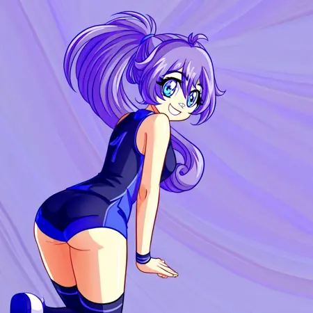Sawyer, solo, 1girl, purple hair, purple ponytail, blue eyes,