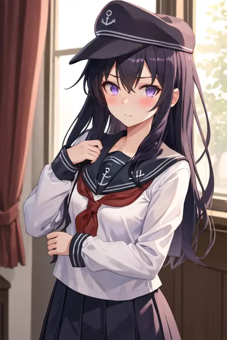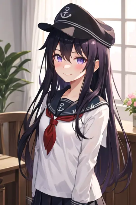 トリガー語は akatsuki_kantaicollection であり、推奨タグは best quality, masterpiece, highres, solo, {akatsuki_kantaicollection:1.15}, long_hair, serafuku, hat, anchor_symbol, purple_eyes, purple_hair, flat_cap, blush, black_hair, hair_between_eyes です。