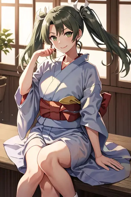 トリガー語はzuikaku_kantaicollectionで、推奨タグはbest quality, masterpiece, highres, solo, {zuikaku_kantaicollection:1.15}, long_hair, twintails, ribbon, hair_ribbon, green_hair, green_eyes, smile, white_ribbonです。