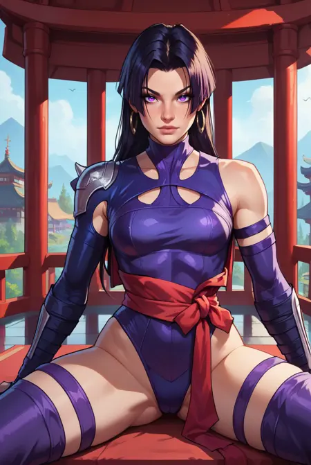 psylocke, black hair, parted bangs, long hair, purple eyes, purple leotard, highleg leotard, thong, thighhigh boots, arm warmers, gloves, red sash, sword, scabbard, silver details
