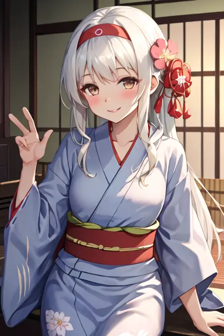 触发词为 shoukaku_kantaicollection,推荐标签为:best quality, masterpiece, highres, solo, {shoukaku_kantaicollection:1.15}, long_hair, hairband, white_hair, brown_eyes, smile, headband, blush, muneate