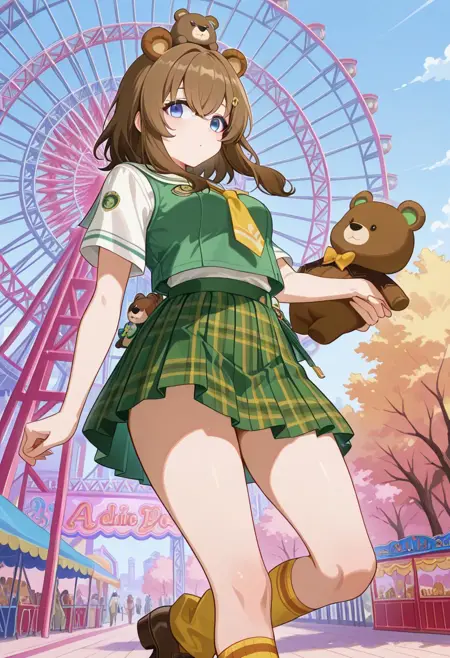 1girl, Yvette-Bear-Around-the-Corner, brown hair, blue eyes, a cropped sailor-style top with white shoulder panels and a green vest-like design, a yellow necktie, a pleated green plaid skirt, bear ears on her head, including a bear keychain, adding a mix of cuteness and danger to her appearance,