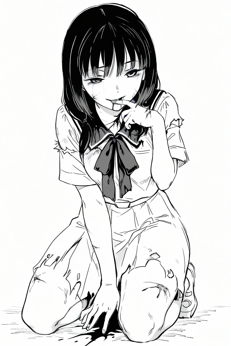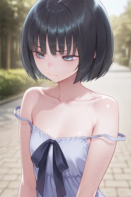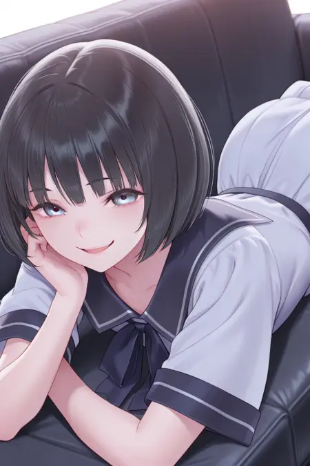 uta, 1girl, solo, looking at viewer, school uniform, short hair, sailor collar, serafuku, bob cut, short sleeves, skirt, bangs, black hair, shirt,