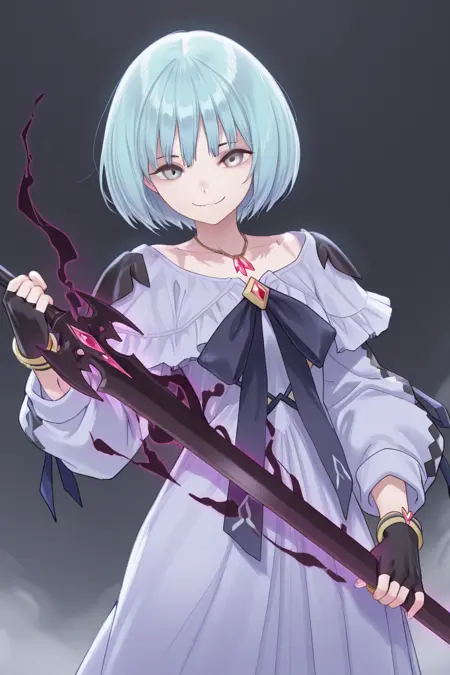 uta, 1girl, solo, smile, short hair, jewelry, necklace, fingerless gloves, looking at viewer, blue hair, dress, grey eyes, reflector