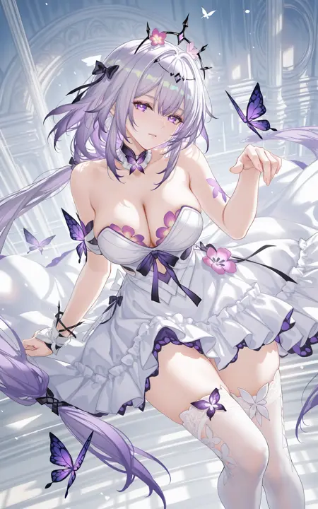 全身:castorice\(honkai:star rail\)、裸の肩、1人 girl、単独、尖った耳、紫の目、髪飾り、長い髪、花、蝶、紫の髪、多色の髪、