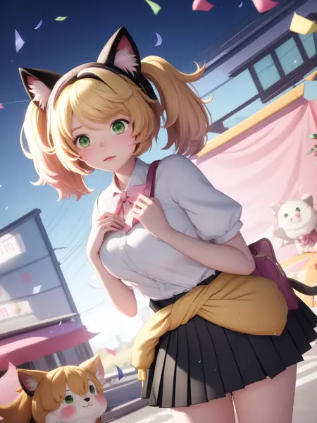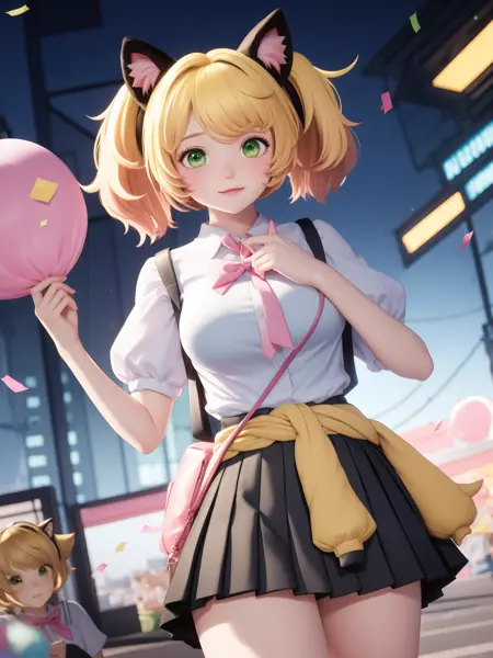 • WZRYdajiSZQL, 1girl, black pleated skirt, blonde hair, animal ears, green eyes, white shirt, twintails, animal ear fluff, bag, blush, collared shirt, clothes around waist, puffy short sleeves,breasts, pink bow, school uniform,confetti,swept bangs,mature female, looking at viewer, cityscape, night,