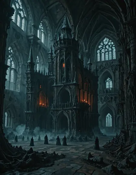 R03, epic scale, epic details, tiny black and red robed congregation in solemn ritual formation, medieval, indoors, occult medieval ceremony,