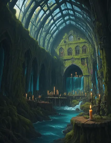 MUR0, very dark, pitch dark, medieval, candles, high ceiling, moon light, moon shades, gold, silver, room, rosace stained glass, arches, medieval furniture, blue, medieval detailed architecture, detailed wall carvings, detailed arches carvings,