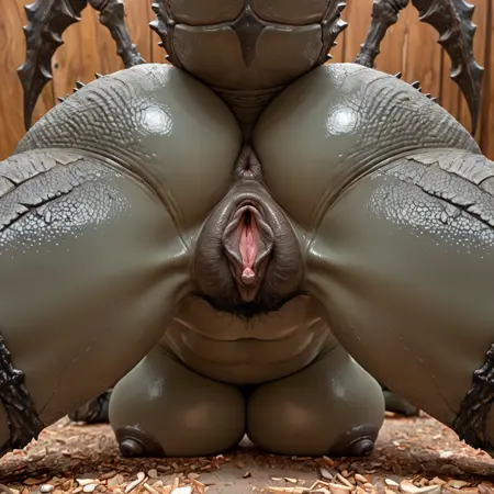 solo, arthropod, no humans, shield head, insect, bug, monster, tail, spikes, full body, humanoid, (carapace skin hiv3gu4rd:1), huge tits, nipples, pincers, bipedal,