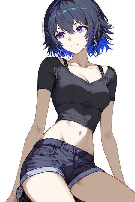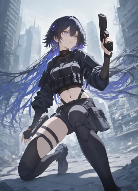 옷차림: 배꼽, 보석, 재킷, 귀걸이, 스타킹, 드러난 옷, 부츠, 반바지, 허리, 목걸이, 검은 재킷, 열린 재킷, 검은 스타킹, 짧은 반바지, 크롭탑, 검은 반바지, 검은 부츠, 검은 목걸이, 긴 소매, 장갑, 허벅지 스타킹, 검은 장갑, 초커, 벨트, 검은 허벅지 스타킹, 검은 초커, 허벅지 부츠, 한쪽 장갑, 비대칭 다리 착장, 불균형 다리 착장, 검은 안티셔츠, 퀼트 재킷, 번개 모양 귀걸이