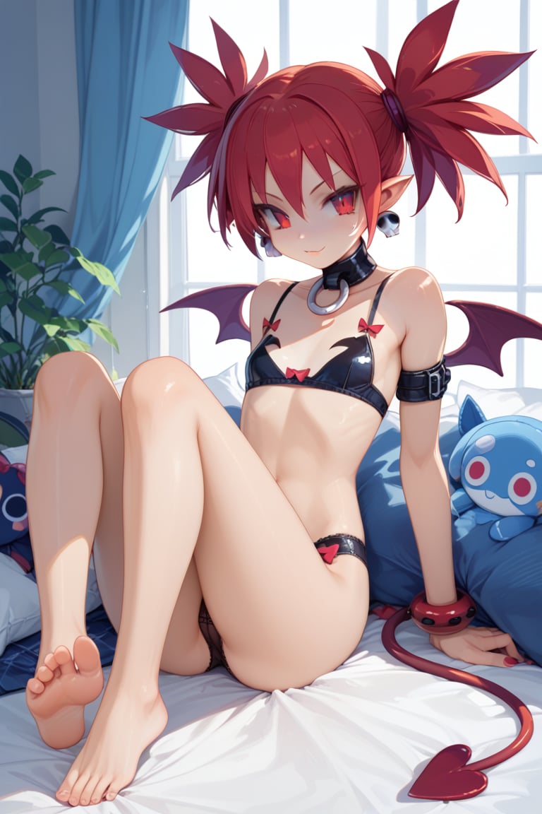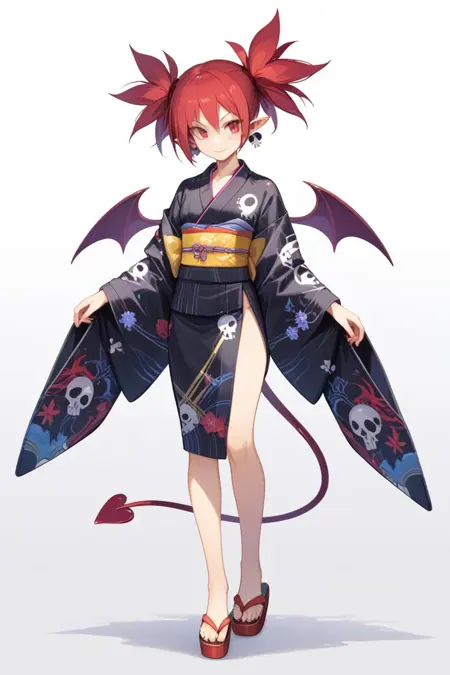 - 1girl, solo, tail, wings, red hair, red eyes, demon tail, twintails, pointy ears, demon girl, bat wings,