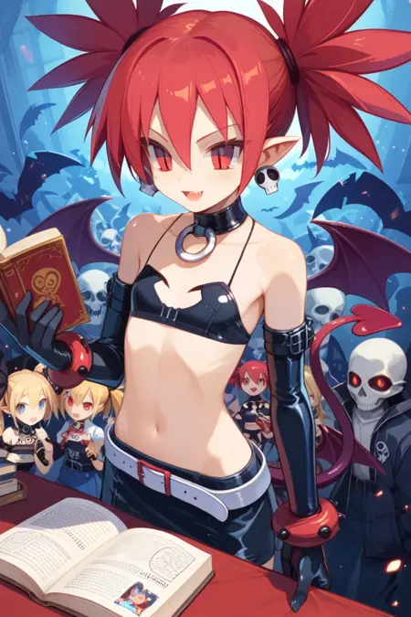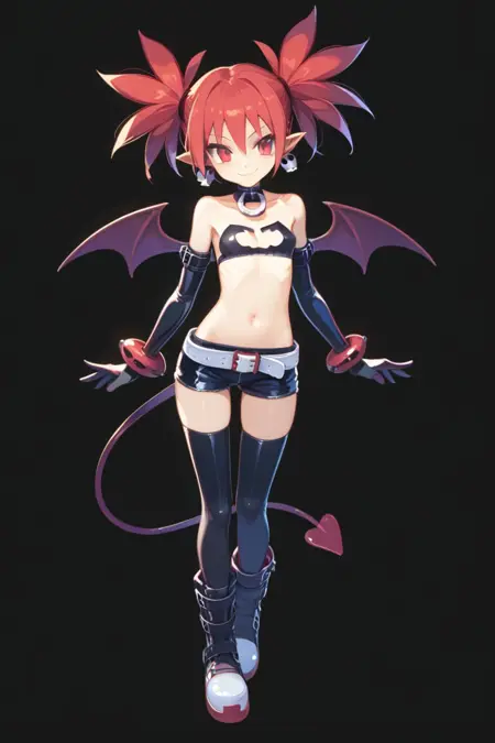 - etna, 1girl, solo, tail, thighhighs, wings, red hair, red eyes, flat chest, gloves, jewelry, demon tail, twintails, pointy ears, demon girl, elbow gloves, earrings, bat wings, boots, smile, skirt, belt, black background, navel, simple background, choker, looking at viewer, black thighhighs, miniskirt, full body, shorts