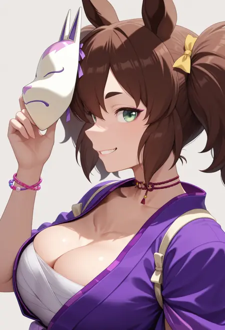 아웃피트 1: 1girl, inari one, 말 귀, 말 꼬리, 갈색 머리카락, 앞머리, 눈 사이의 머리카락, 녹색 눈, 더블테일, 머리핀, 머리에 마스크, 여우 마스크, 자주색 기모노, 일본 복장, 가슴 노출, 사라시, 오비, 시메나와, 주름 치마, 치마 아래 단축바지, 목걸이, 팔찌, 양말, 타비, 여우 그림자 인형