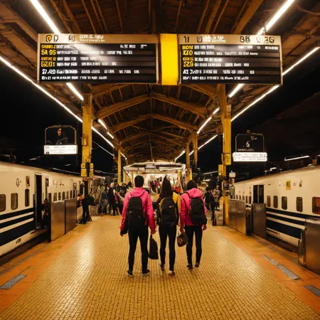 kaidan, STOKYO, train station, scenery, multiple boys, hat, bag, 2boys, pants, stairs, train, railing, real world location, male focus, standing, sign,