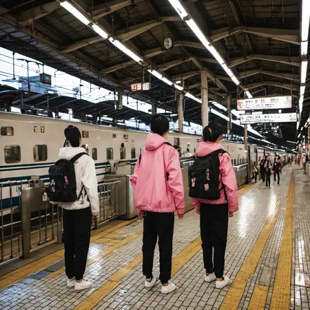STOKYO, train station, N700S, train, railroad tracks, scenery, pants, multiple boys, winter uniform, black pants, standing, school uniform, real world location, jacket, ceiling light, kita high school uniform, short hair, realistic,