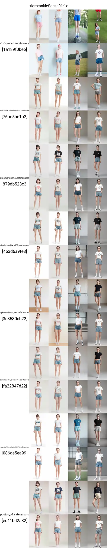 Generates ankle socks reliably. Current models apparently only generate calf-, knee- or even thigh-high socks when prompted with "ankle socks" or "ankle_socks."