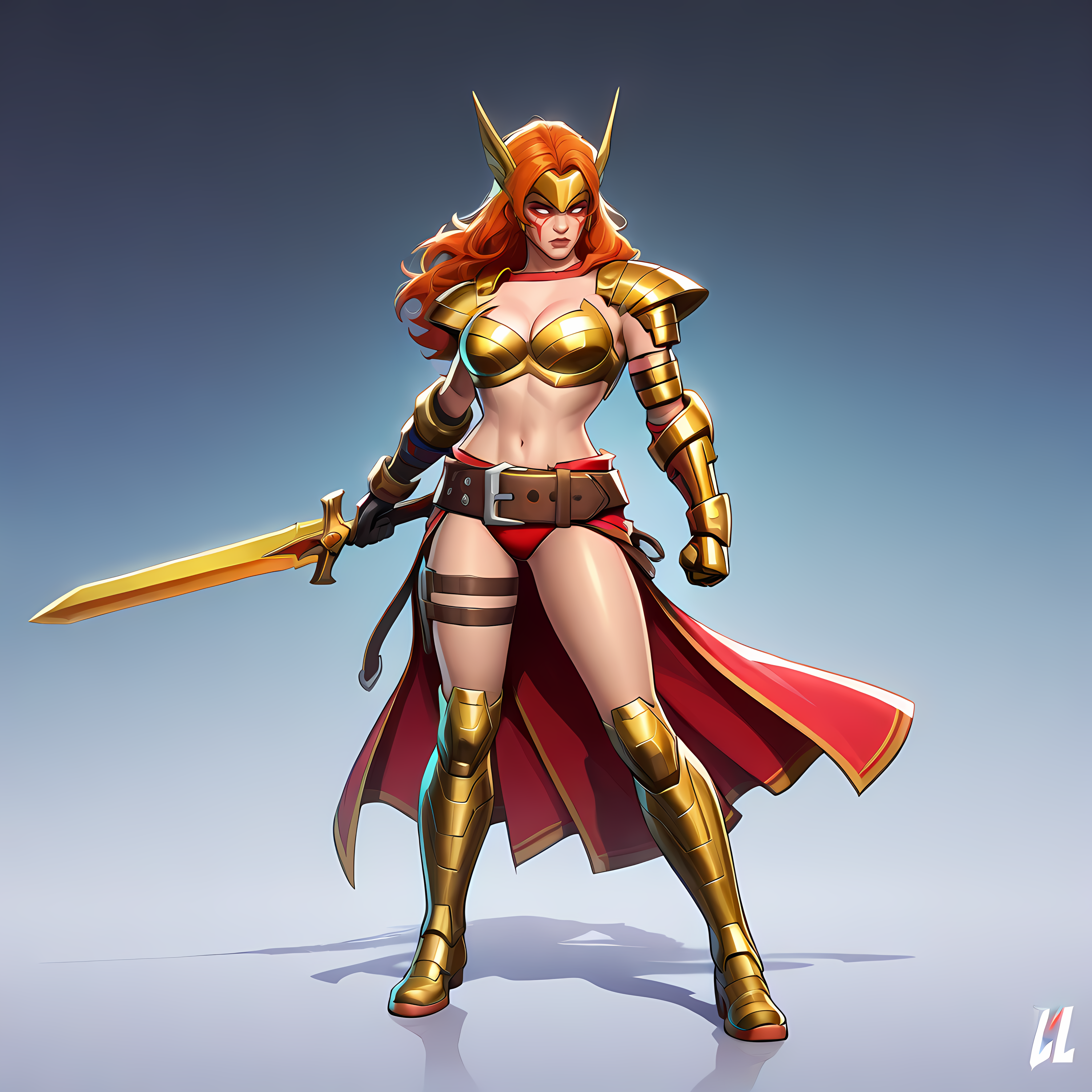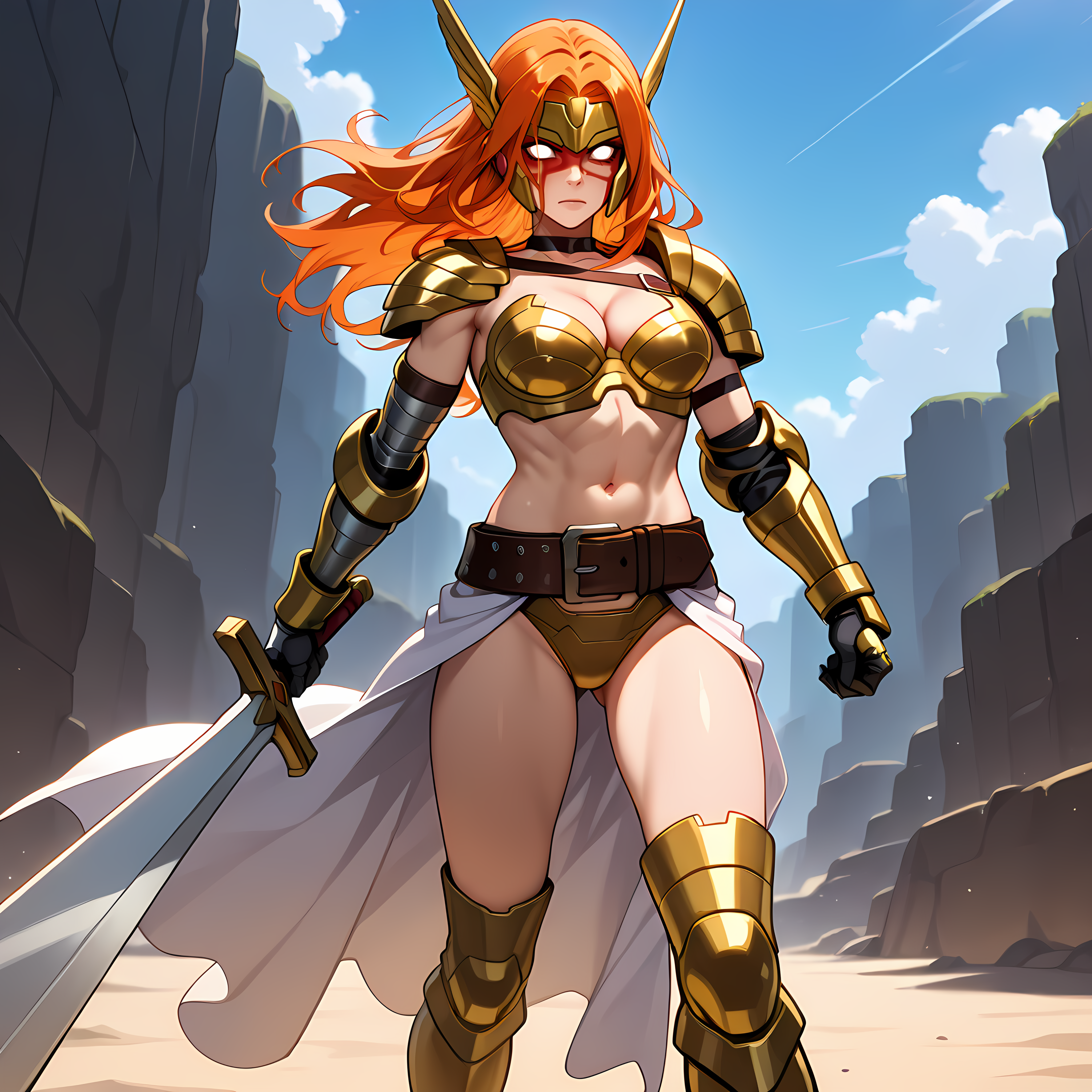 추가: 긴 머리, 주황색 머리, 하얀 눈, 동공 없음, 빨간 얼굴 무늬, 벨트, 비키니 갑옷, 어깨 갑옷, 파울드론, 허리 망토, 부츠, 헬멧, 금색 갑옷, 장갑, 배꼽, 가슴 노출, 검을 들고 있음