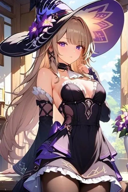트리거 단어: m_herta_a, 갈색 머리카락, 긴 머리카락, 보라색 눈, 마녀 모자, 모자 꽃, 검정 목걸이, 분리된 소매, 헤르타 드레스, 검은 드레스, 분리된 소매, 어깨띠 없는 드레스, 팬티스타킹,