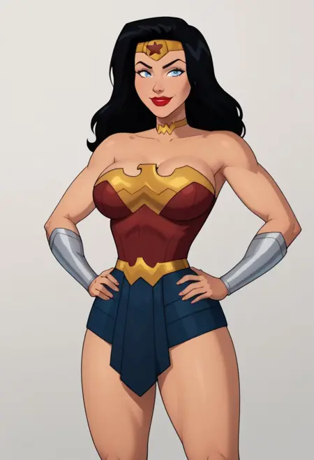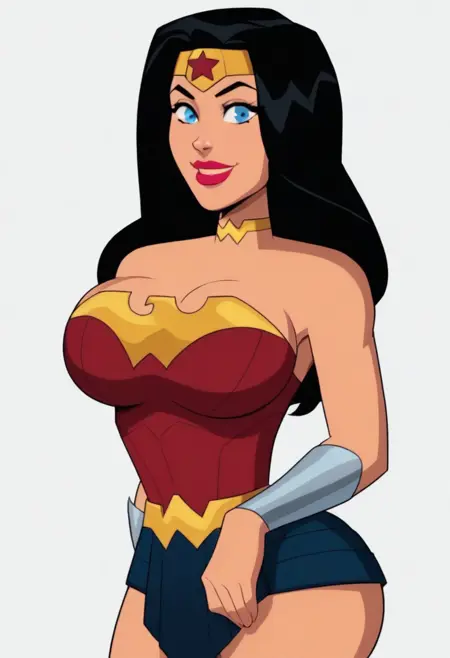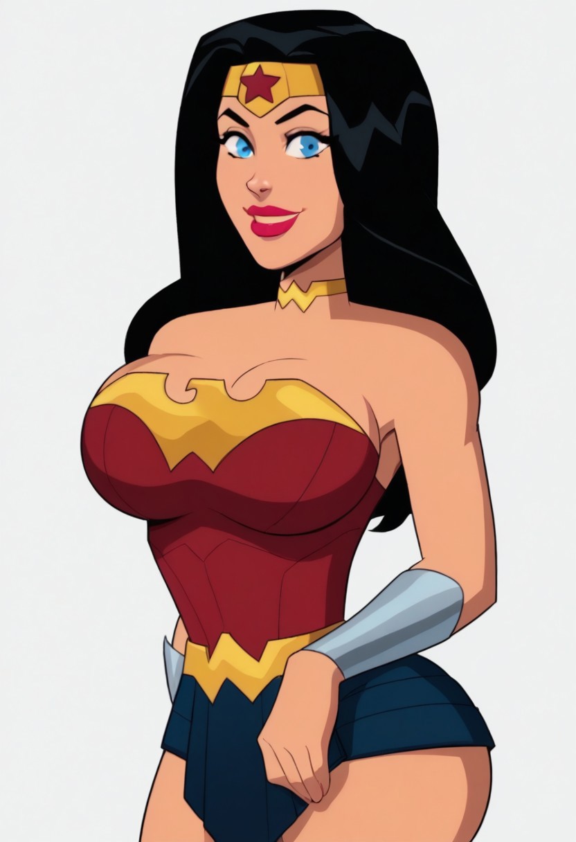 | 训练词汇 | 1girl, solo, DC Comics, Wonder Woman, Diana Prince, Blue Eyes, red lips, lipstick, Black Hair, Long Hair, gold tiara, gold choker, bare shoulders, collarbone, red corset, armor, gold belt, blue skirt, silver bracers, red thigh boots, armored boots已复制! |