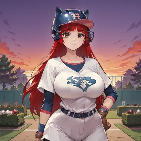 야구복: 야구 유니폼, 야구 헬멧, 헬멧에 고양이 귀, 흰색 셔츠, 셔츠 로고, 거대한 가슴, 흰색 반바지, 넓은 엉덩이, 양말, 흰색 신발,