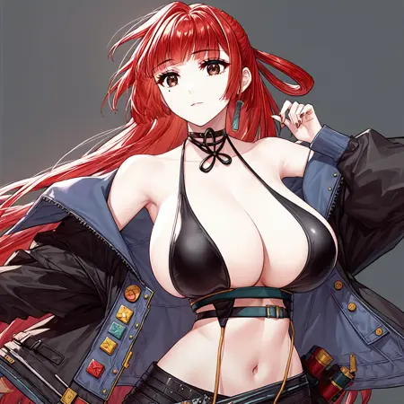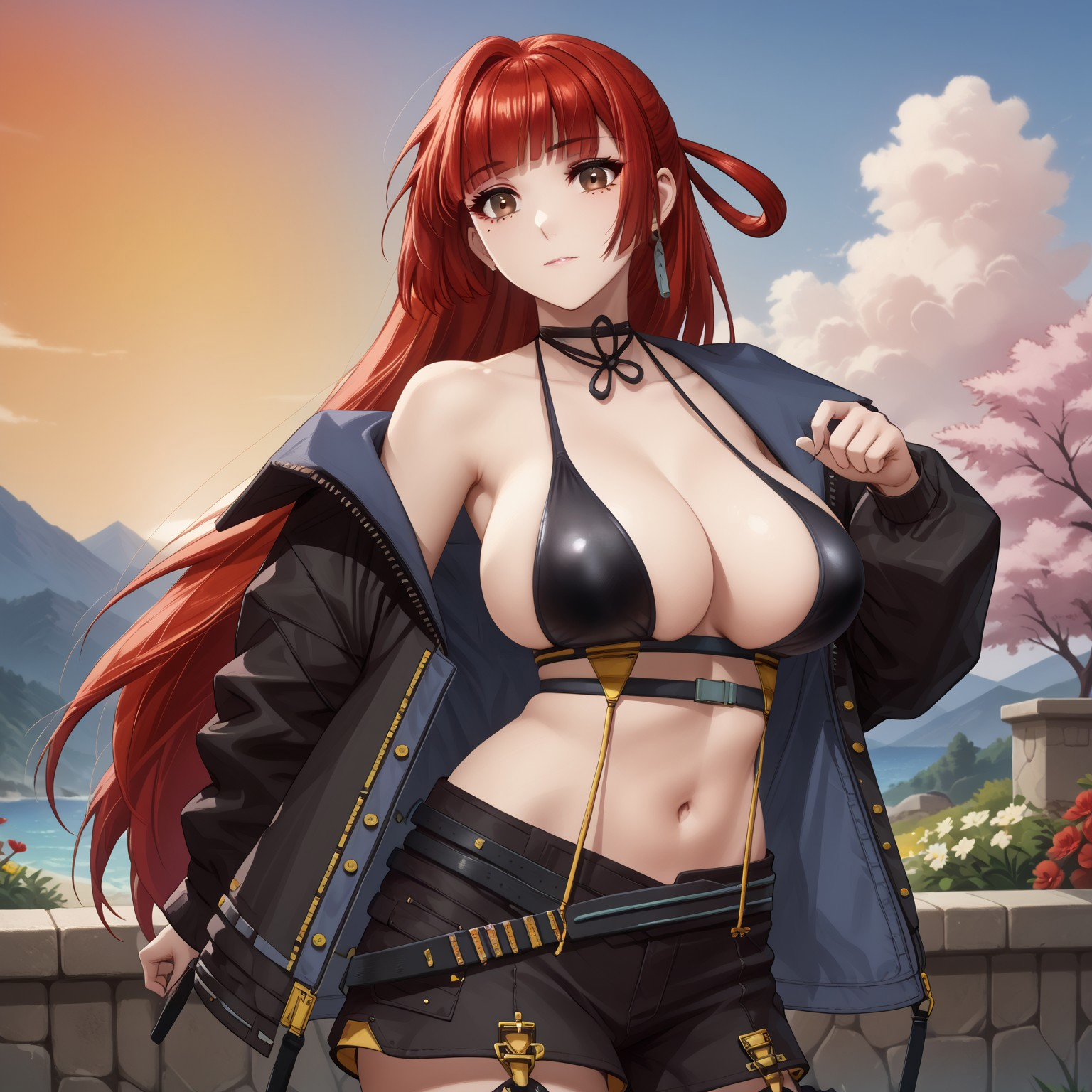 기본 복장: 헤어 리본, 1개의 하나후다 귀걸이, 초커, 벌어진 재킷, 어깨 노출, 거대한 가슴, 비키니, 배꼽, 반바지, 넓은 엉덩이, 부츠,