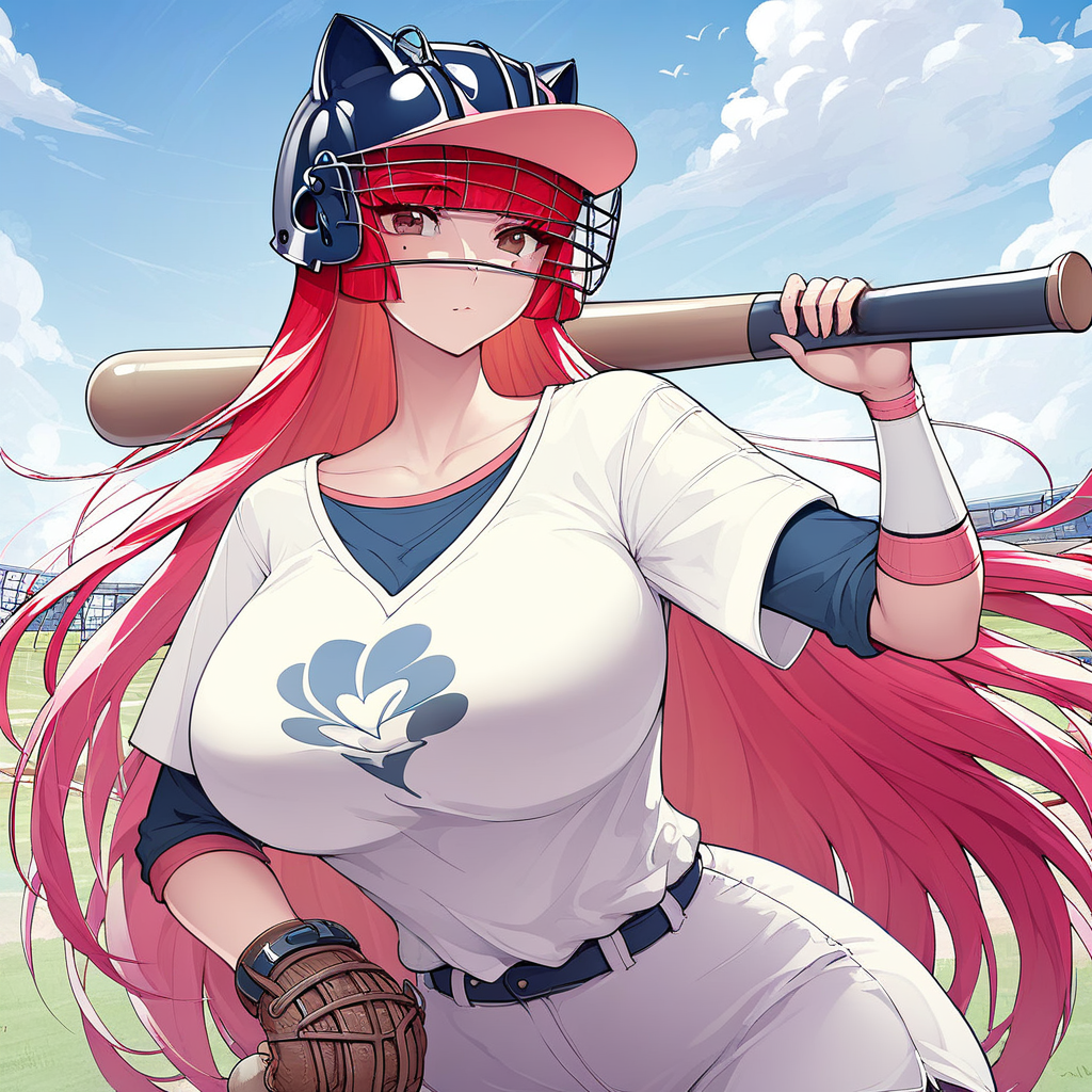 야구복: 야구 유니폼, 야구 헬멧, 헬멧에 고양이 귀, 흰색 셔츠, 셔츠 로고, 거대한 가슴, 흰색 반바지, 넓은 엉덩이, 양말, 흰색 신발,
