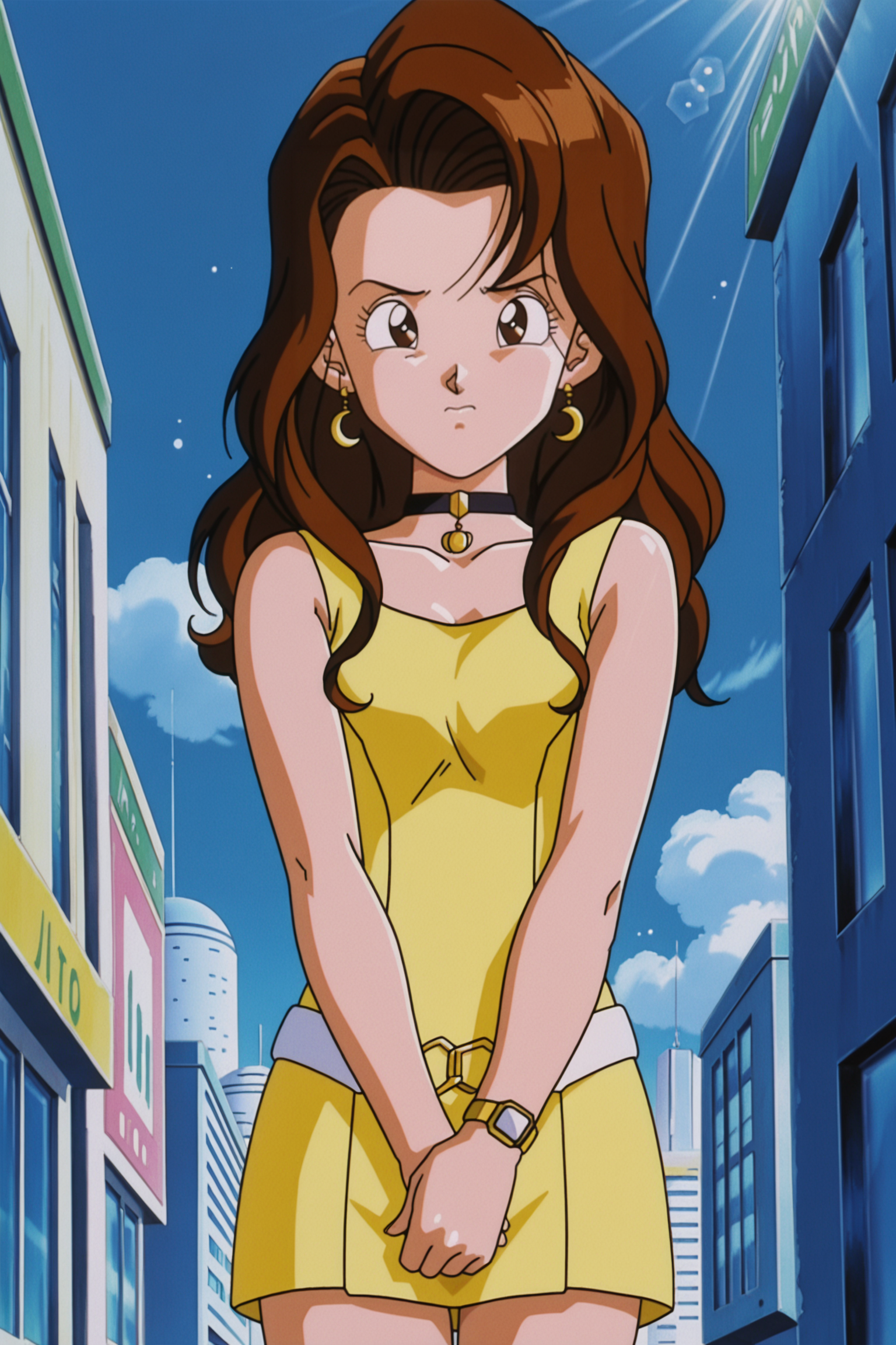 black choker, cleavage, yellow dress, short dress, sleeveless dress, white belt, boots, yellow footwear,