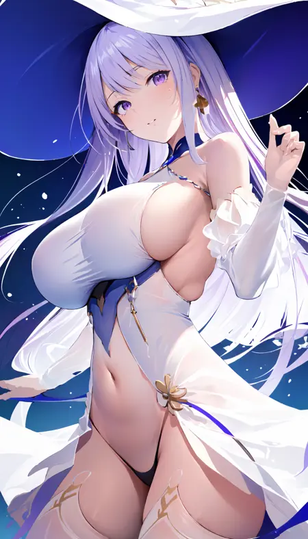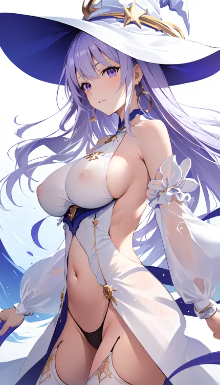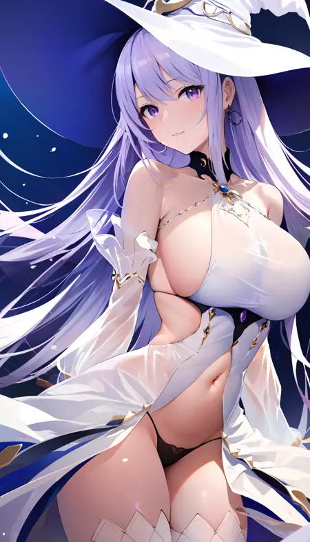 1girl, solo, navel, whale tail (clothing), witch hat, panties, stocking, pantyhose, light purple hair, jewelry, dress, sideboob, thighhighs, white dress, covered nipples